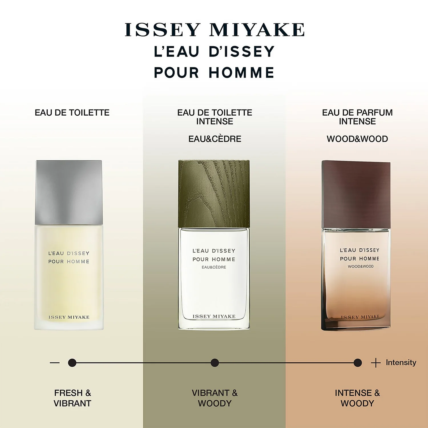 L’Eau de Toilette Intense L’Eau d’Issey Pour Homme Eau & Cèdre is a simple, vibrantly fresh fragrance. The strength of cedarwood is enhanced by water. The top notes consist of the fiery freshness of cardamom. The heart notes reveal an aquatic accord shaped by the roughness of cedarwood. The base notes comprise woody and majestic notes of vetiver and patchouli essences.