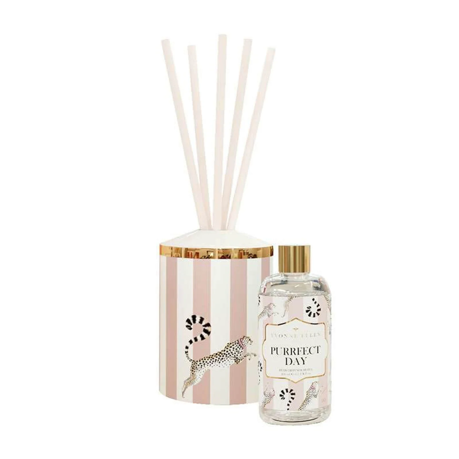 This Purrfect Day Ceramic Reed Diffuser features a playful cheetah print on pink and ivory candy-stripes, adding fragrance and fun to the home. It is presented in a delightful printed box, making it a fantastic gift for any occasion.
