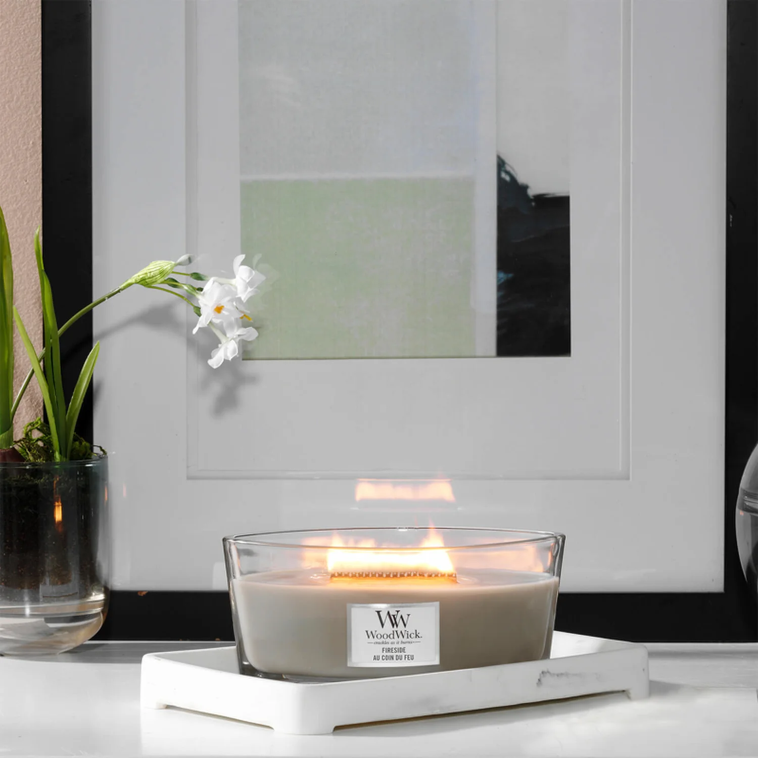 This is WoodWick’s top-quality genuine Hearthwick Candle – Famous for its soothing sound of a crackling log fire when burning, these luxuriously scented candles will burn for up to 80 hours. Hearthwick Flame Scented Candles by WoodWick let you experience the cosy comfort of a glowing fireplace anywhere in your home with its soothing crackle and long, dancing flame. Made of a high-quality soy wax blend which produces a slow, clean burn and is available in a wide variety of fragrances. The candle top also doubles as a heat-resistant mat.