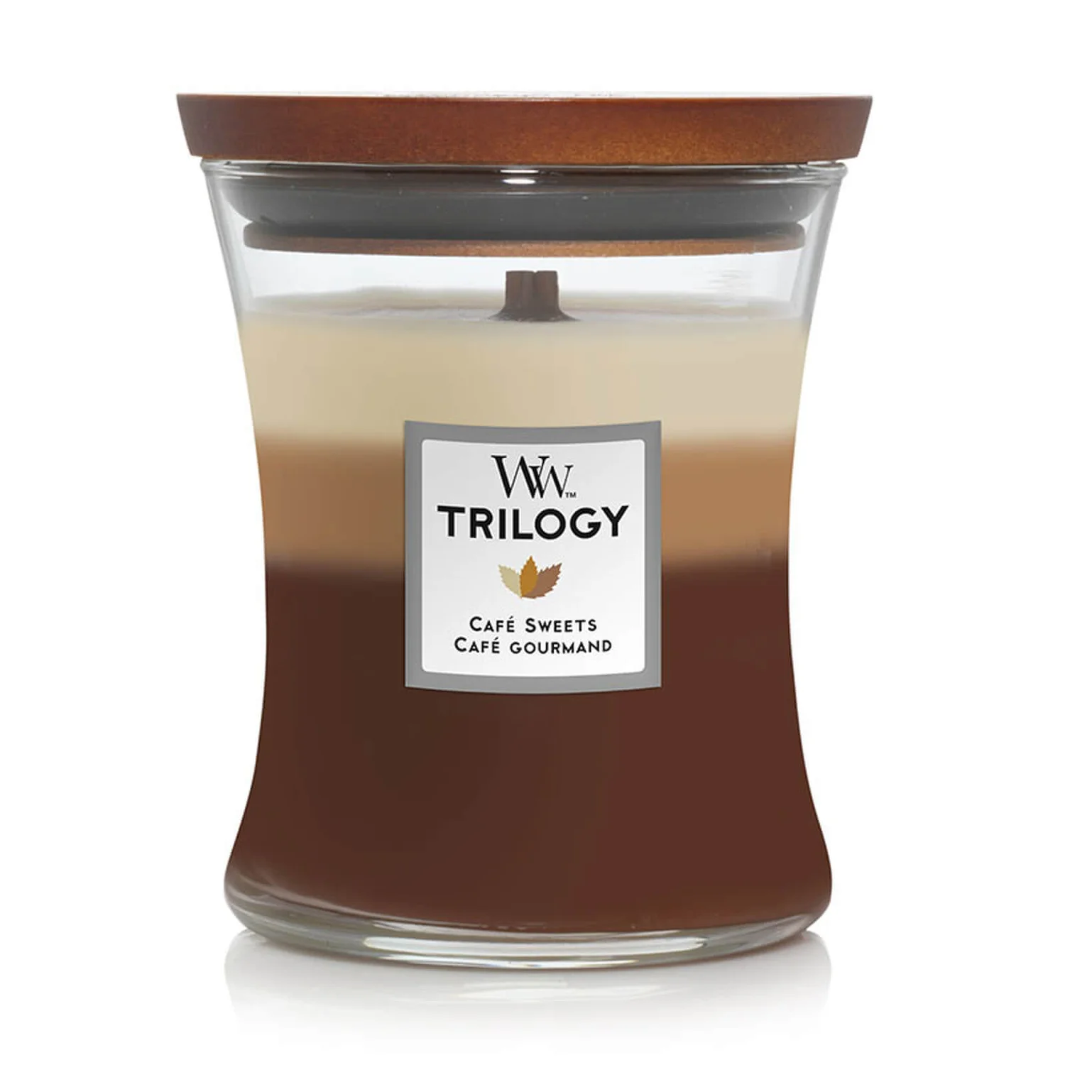 These are WoodWick’s top-quality genuine Trilogy Candles – famous for the soothing sound of a crackling log fire when burning, these luxuriously scented candles are available in both medium and large jars. Each colour layer contains a different fragrance. As the candle burns, each fragrance and colour melts into the next layer, creating a unique new fragrance. Made of a high-quality soy wax blend which produces a slow, clean burn and is available in a wide variety of fragrances. The candle top also doubles as a heat-resistant mat.